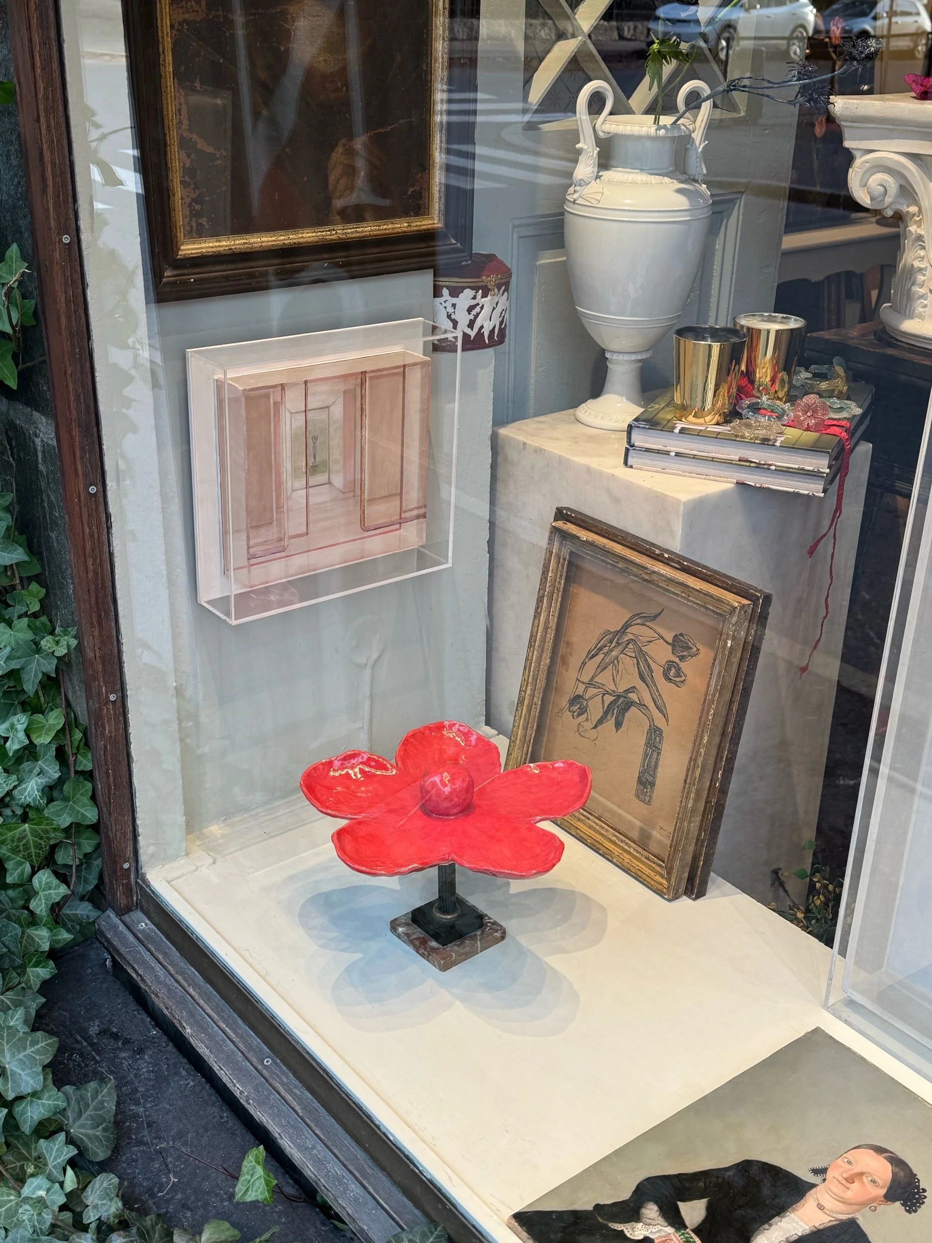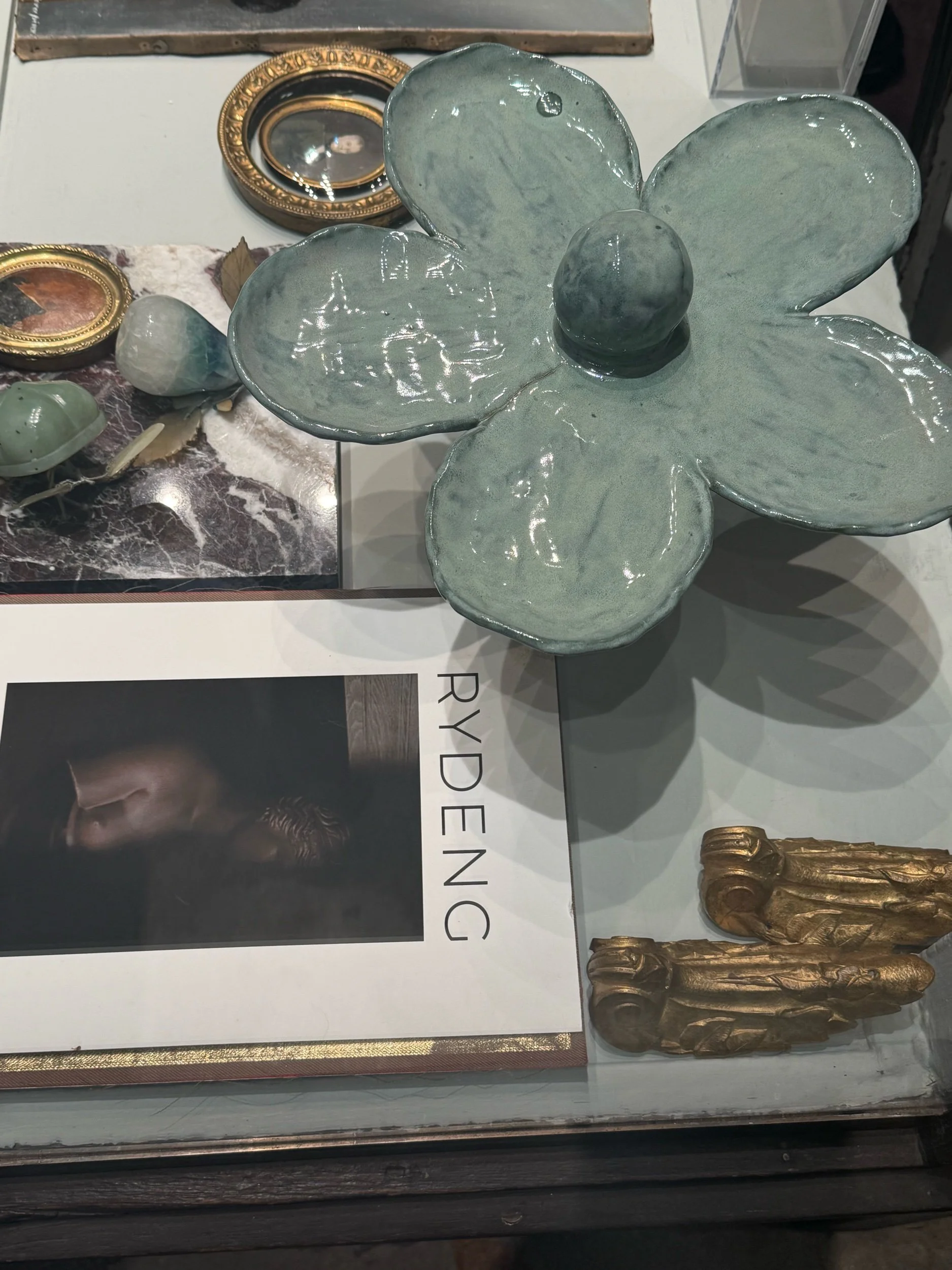 Det første blomsterfatet ble laget i Munch’s atelier på Ekely da jeg var så heldig å få arbeide der en måned i 2023. Det er laget i hvit steingodsleire og brent to ganger. Først opp til 900° (råbrann) og så andre gang opp til 1240° (glasurbrann) slik at den fargerike glasuren smelter perfekt. Hvert fat er unikt og signert.